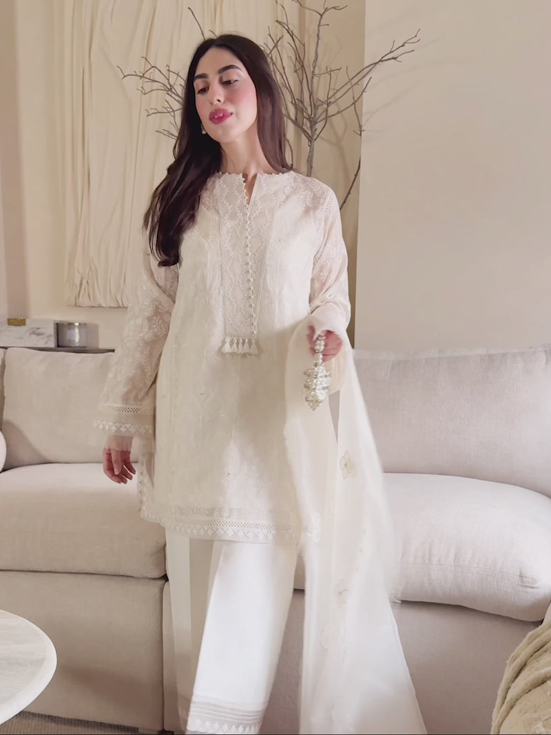Sophisticated and effortlessly timeless; this pure organza tunic is crafted in a subtle ivory hue; this look is adorned with delicate ivory embroidery all over. Paired with a luxurious pure organza dupatta, finished with embroidered borders on all four sides. This look is completed with pure raw silk pants detailed with organza embroidered borders. Perfect for intimate gatherings and elegant evenings.
